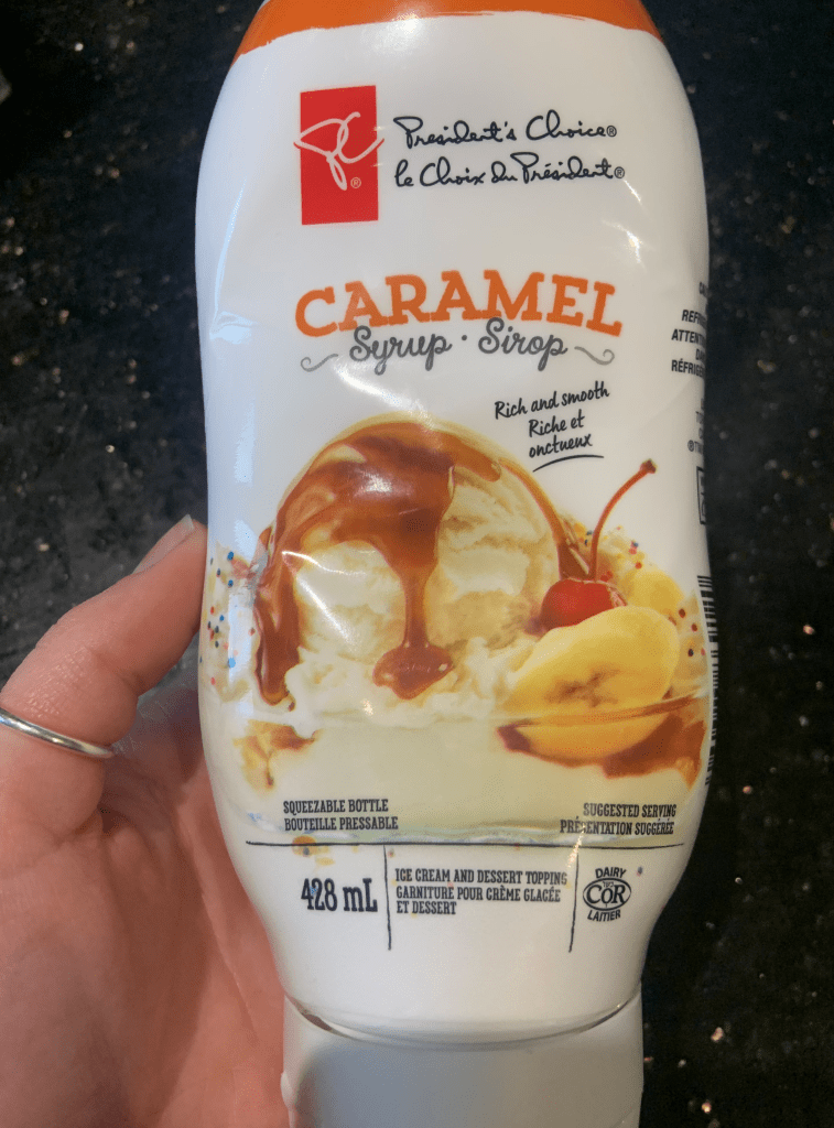 1) Start with any caramel syrup. I chose a PC brand ice cream topping that will cost you around $3.50 at No Frills and it works super well.
